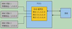 当HDMI接收端设备上电后,系统通过I2C将EDID数据包括HDMI端口1的物理地址写入PS321的EDID