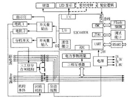 控制器由ARM及输入输出、显示、电源和485通信等模块组成,见图2。CPU采用S3C44BOX作为微处理器,ARM在基本RISC结构上增强的特性使ARM处理器在高性能、低代码规模、低功耗和小的硅片尺寸方面取得良好的平衡。输入/输出采用串行接口芯片74LS164/165,液晶模块采用LCM122×32,RS232/RS485接口部分采用Maxim系列芯片进行电平转换,控制器的实时时钟用DS1302实现,Flash Memory选用SSTT的39VF020存储器,选用ISSI的62LV1024SRAM芯片作为外扩数据交换区,两路三相电压电流的采样采用隔离变压器完成,采样精度为1%。控制器电源电压为220V(50Hz/60Hz)或12V/24V直流电源。