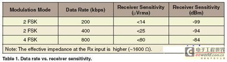 收发器采用一种中频(IF)低的带镜像抑制混频器的超外差架构。低的中频可使滤波器和调制器功耗最小,没有与高数据率、零中频架构相关的闪烁噪声和直流偏移问题。FSK调制方案降低了发射放大器线性要求,因而降低了功耗,并可以使用更简单的限制接收器。