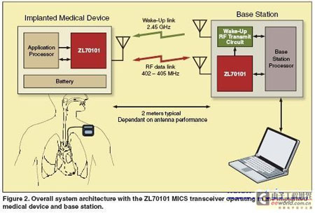 ZL70101工作于植入设备和外部基站(见图2)。基站包括发射2.45 GHz唤醒信号的附加电路。系统一旦通过2.45 GHz唤醒信号启动,就通过402MHz到405MHz MICS频带收发器交换数据。