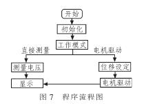 号发生器子程序、扫描键盘子程序等。除了数据运算和显示外,本系统还附加了自校正功能,即通过比较两路信号的幅值控制电机的正转和反转,最终使铁芯停在参考零的位置。图7为程序流程。