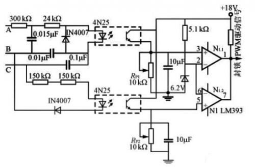 输出电平低于比较器的反相输入端的基准电压,比较器输出低电平,封锁PWM驱动信号,关闭电源。比较器输入极性稍加变动,亦可用高电平封锁PWM信号。这种缺相保护电路采用光耦隔离强电,安全可靠,RP1、RP2用于调节缺相保护动作阈值。