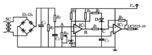 图8是利用电流传感器进行过流检测的IGBT保护电路,电流传感器(SC)初级(1匝)串接在IGBT的集电极电路中,次级感应的过流信号经整流后送至比较器IC1的同相输入端,与反相端的基准电压进行比较,IC1的输出送至具有正反馈的比较器IC2,其输出接至PWM控制器UC3525的输出控制脚10。不过流时,VA<Vref,VB=0.2V,VC<Vref,IC2输出低电平,PWM控制器正常工作。