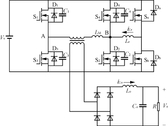 从上面的分析可知,滞后桥臂的开关动作发生在回流过程向能量传送过程的转化阶段,由于输出电感电流不能反馈到原边,使滞后桥臂的开关管并联电容只能依靠变压器原边的谐振电感进行充放电,而谐振电感中存储的能量很小,使得滞后桥臂开关管实现零电压开通变得很难,特别是在低负载的时候更为明显。