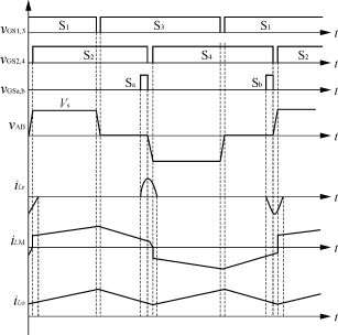 为了克服滞后桥臂实现零电压开关难的问题,同时又不会引起占空比的丢失和开通损耗的增大,文献提出了一种在滞后桥臂并联一个谐振电感和两个谐振开关的拓扑结构,如图2所示。开关的控制策略如图3所示。本拓扑在半个周期内有6个工作模态。