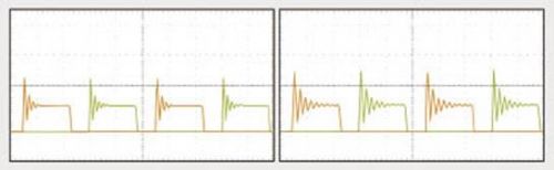图11 500W PSFB DC-DC转换器中功率MOSFET的峰值漏-源电压,软器件(左),snappy器件(右)软体二极管的另一个优点是它能够使用额定击穿电压较低的器件。由于单位面积的导通阻抗与击穿电压成比例,故它还能降低传导损耗。