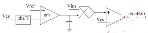 芯片采样Vcs和tdis/T两个信号,再将两个信号相乘和Vref相比较;两者的差值经过一个跨导放大器(gm)和Ccomp电容滤波,再将滤波的结果和Vin的采样结果Vins一起送入到乘法器相乘;乘法器输出即为Vcs的给定信号,芯片以此来控制开关管的关断。其芯片内部的逻辑框图如图1所示。