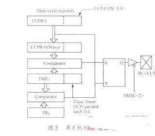PICl6C73是一款中档单片机,PICl6C73内部有两个CCP(Capture、Compare、PWM)模块,当它工作在PwM模式下,CCP x引脚就可以输出占空比10位分辨率可调的方波,图2为其工作原理图。