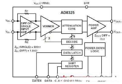 AD8325具有一个可变衰减器内核,以数字方式控制衰减,范围为0 dB至–59.45 dB。输入缓冲器的增益大约为+ 30 dB,因此得到的总增益范围为–29.45 dB至+30.0 dB。在上电模式下,AD8325包括四个模拟功能。输入放大器(前置放大器)可以采用单端或差分配置。8位控制字解码成一个3位字和一个9位字,前者驱动游标级(精密增益调整),后者则驱动衰减内核(DAC)。游标级中实现0.7526 dB/LSB分辨率,总衰减约为5.25 dB。在游标级之后,由DAC提供AD8325衰减的批处理(9位或54 dB)。前置放大器和游标增益模块中的信号为差分形式,以提高PSRR和线性度。差分电流从DAC馈入输出级,后者将这些电流放大到驱动75 负载所需的合适电平。AD8325在上电和关断情况下均可保持恒定的75 动态输出阻抗,这是该器件的一项主要性能和成本优势。输出级利用负反馈来实现75 差分动态输出阻抗。这样便无需使用外部75 端接电阻,进而产生是标准运算放大器两倍的有效输出电压。