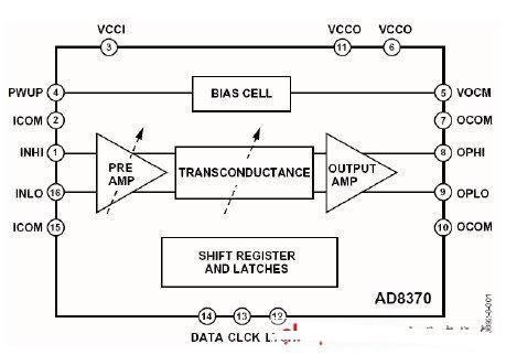 AD8370是一款低成本、数字控制、可变增益放大器,可以提供精密增益控制、高IP3和低噪声系数。框图如图9所示。