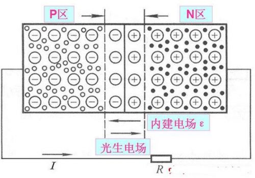 在P区中:的光生电子(少子)同样的先因为扩散、后因为漂移而进入N区,光生空穴(多子)留在P区。如此便在P-N结两侧形成了正、负电荷的积累,使N区储存了过剩的电子,P区有过剩的空穴。从而形成与内建电场方向相反的光生电场。