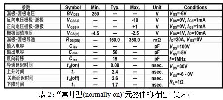 罗姆开发的"常开型(normally-on)"型元器件的特性见表2,是栅极宽度为9.6cm的元器件,命名为"HEMT",可查到的其高频特性的文献非常少。起初罗姆以尽量确保高频特性为目标进行了开发,结果表明,罗姆的"常开型(normally-on)"元器件的动态特性非常优异。表中的td(on)、tr、td(off)、tf等特性指标表示高速性能。由于是"常开型(normally-on)"元器件,因此栅极进入负电压瞬间,元器件关断,0V时元器件导通。符号表示方法是:栅极电压信号关断时(元器件开始向ON移行时)为t = 0,源极/漏极间电压Vds减少到施加电压的90%之前的时间为td(on),从90%减少到10%的时间为tr,另外,栅极电压信号导通时(元器件开始向OFF移行时)为t = 0,Vds增加到施加电压的10%之间的时间为td(off),从10%增加到90%的时间为tf。