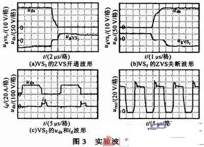 在Pspice 9.2环境下对变换器进行仿真实验,结果表明该拓扑能够实现所有功率开关管的软开关及二极管的软换流,且次级电压应力较低。为进一步验证理论分析的正确性,研制了一台输出为48 V/20 A的实验样机,在样机上进行了波形测试分析,实验波形如图3所示。图3a,b为VS1的ZVS开通、关断波形,其中,uds为漏源电压,ugVS1为驱动电压。图3c为VS2的ZCS波形,其中,id为漏极电流。图3d为urec波形。