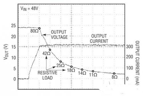虽然LTC3630能提供高达500mA的输出电流,但图1中的电路是针对300mA最大值进行设置的。从ISET引脚输出及内部产生的5?A偏置电流在ISET电阻器两端产生一个电压,此电压决定了最大输出电流。图4示出了当一个阻性负载从大约100Ω降到低至8Ω的输出电压,同时输出电流保持在接近300mA编程值的情况。此外,该DC/DC转换器中使用的迟滞拓扑还可提供固有的短路保护。