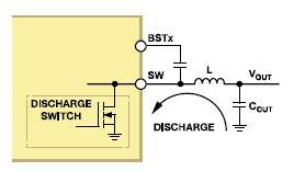 有源输出放电开关:每个降压调节器均集成一个放电开关,它连接在开关节点与地之间(图6-4)。当其相关调节器禁用时,开关接通,有助于使输出电容快速放电。对于通道1至通道4,放电开关的典型电阻为250Ω。当调节器禁用时,即使有大容性负载,有源放电开关也会将输出拉至地。这样就能显着提高系统的稳定性,尤其是在周期供电时。