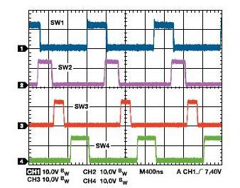 降压调节器相移:降压调节器的相移可通过I2C接口设置。默认情况下,通道1和通道2之间以及通道3和通道4之间的相移为180°,如图11所示。反相操作的优势是输入纹波电流和电源接地噪声更低。