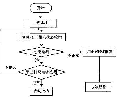 反电势检测法只有在电机正常运转后才能进行,当电机不转或转速很低时,其反电势无法检测,因而采用软件启动的方式。针对无位置传感器无刷直流电机的控制,本文采用三步启动的方法,首先,给A,B相通电一段时间以固定电机转子位置;六状态轮流换向,通电时间逐步减少;检测第三相的反电势,若正常则启动成功,否则重新启动。具体的启动流程如图4所示。