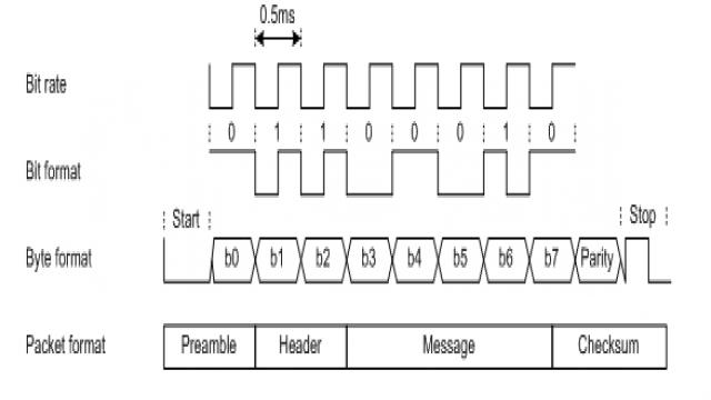 WPC标准还定义通信中的数据格式。在每次数据传输中,将传输一个数据包。一个数据包由一个用于位同步的前同步码(11位以上1)、指明数据包类型的一字节消息头、消息信息(1..27字节)和一个检验和字节组成。一个数据字节为11位串行格式。此格式由一个位起始位、八个数据位、一个校验位和一个位停止位组成。起始位为零。数据位的顺序从最低有效位开始。校验位为奇数,停止位为一。数据位采用差分双相码编码,其速度为2Kbps。数据格式如图7所示。