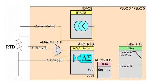 我们再来看一下方程5和方程6。测量的准确度主要取决于Rref的精确度。为了在电压激励中克服这个问题,RTD使用恒流源来代替电压源。当使用恒流源时,穿过RTD的电压降只取决于其电阻值和恒流源值。然而,使用恒流源励磁时测量的准确度取决于电流源的精确度。由于是进行精密的温度测量工作,DAC电流应该被TIA校准。图6显示了使用PSoC3和PSoC5器件实现的一个基于RTD的温度测量系统。这些器件有片上电流源,不需要额外增加模拟放大器电路。同时,这些设备有片上TIA可以用于为IDAC校准。