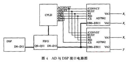系统要求对4路频率为16 kHz 的模拟信号进行同时采样,采样时不 能有相位差。AD7862虽然有4路模 拟输入通道,然而内部只有两个 ADC,即每片A/D只能同时采样两 路模拟信号,因此系统中采用了两 片AD7862来完成对模拟信号的采 样[3]。A/D与DSP接口如图4所 示。