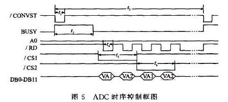电路中两片A/D除了片选控制信号以外其 他的数据总线以及控制总线全部是分别连在一起 的。将片选控制与其他控制分开的原因在于:A/ D芯片的初始化以及转换过程需要同时完成,但 是数据的输出需要分别完成,否则会出现总线冲 突。ADC时序控制框图如图5所示。