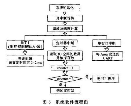 TMS32O5416的软件设计主要包括初始化程 序,主程序,外部中断程序,定时器中断程序和串 行口中断程序。初始化程序完成DSP及外围芯片 的初始化,主程序将采集到的数据滤波后进行 FFT运算提取幅度值。串行口中断程序完成接收 矩阵的发送。系统软件的工作流程如图6所示,当模拟信号进来并开始采样时,即发射部分的时序控制逻辑为OO时,产生INT1,DSP开启定时器中断并设置定 时器的值为2 ms。定时器中断后,DSP从FIFO 中读取前2 ms时间段内采集到的所有数据,