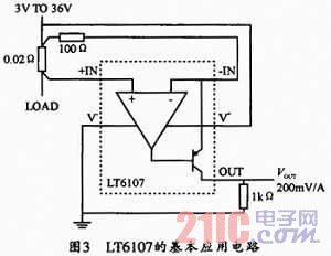 LT6107通过对可调节检测电流的设置来监视电流,其检测电压是经可调增益放大得来的,而且是从正电源电压到基准地的线性变化的。加入一个输出滤波器,其输出信号也可以作为模拟信号使用。图3所示为LT6107的一个基本应用电路图。