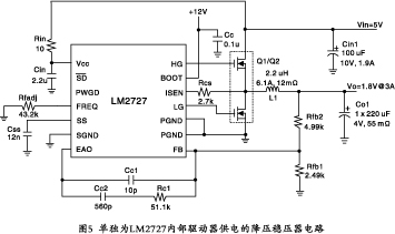 图5所示是一种单独为LM2727内部MOSFET栅极驱动器供电的降压稳压器电路。该电路消除了由D1和Cboot组成的自举电路,+12V的电源电压直接加至1C的BOOT端。这种稳压器的输入电压Vin为5V,输出为1.8V/3A,开关频率为600kHz。Q1/Q2采用Si4826DY型双N沟道MOSFET。