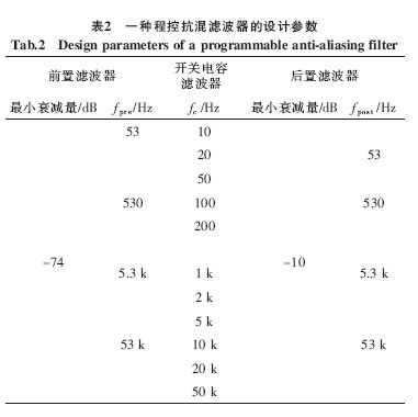 图5为此程控抗混滤波器的结构,三级滤波器的频率设置及最小衰减量如表2所示。其中,前、后置滤波器的一个转角频率可覆盖开关电容滤波的3个频率。例如,前置滤波器与后置滤波器置在53 Hz的转角频率可与开关电容滤波的10 Hz,20 Hz和50 Hz 3个频率对应,其余类推。