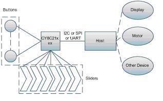 目前广泛应用的触摸感应芯片(CY8C21xxx,CY8C20xxx)的典型应用框图如图1。