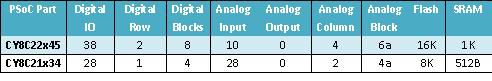CY8C22x45最大支持38个GPIO,16K的flash以及1K的SRAM,同时与其他的PSoC设备一样,片上还集成了I2C,MAC等系统资源。除此之外,CY8C22545还提供了经过优化的专用10位SAR的ADC以及专用的双通道CSD模块和RTC。它与CY8C21x34的资源对比如下表1。