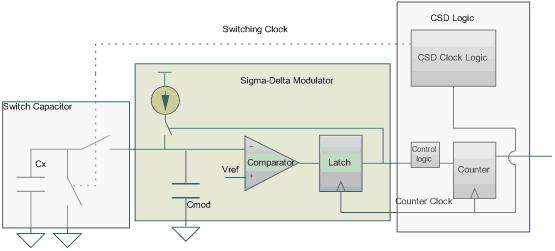 如图3和图4所示,双通道CSD的充电时钟以及计数时钟有专门的CSD Logic来生成,不需要占用系统时钟。在IDAC的配置模式下,单个通道仅仅需要一个外置的Cmod电容就能够进行工作。而Rb的配置模式下,需要外接一个充电电阻Rb。Rb和IDAC的作用是根据Sigma-Delta调制器的输出进行间歇性的充电。CSD Logic中还集成了专用的计数器,不再需要占用数字模块构成计数器。