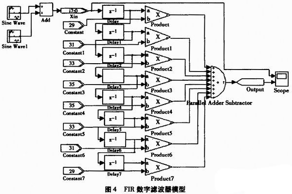 根据FIR数字滤波器的原理,在Matlab/simulink中进行设计的输入,利用Altera DSP Builder中的模块进行滤波器模型的搭建,然后将计算好的FIR数字滤波器系数输入到搭建的模型中,图4所示为搭建好的FIR数字滤波器模型。