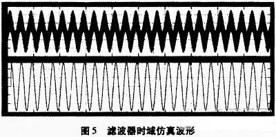 在搭建好的模型中加入两个正弦波合成的输入信号,运行仿真,通过Scope窗口观察滤波器时域仿真波形如图5所示。
