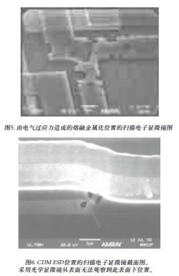 确定器件是否是由于ESD或电气过应力(EOS)而发生故障较为困难,一般最好交由故障分析工程师处理。执行电气分析和内部可视分析时,ESD损害一般没有EOS的损害明显。对于ESD,1 kV或以上(取决于器件的ESD额定值)的事件会毁坏氧化层(管芯的层间电介质)并在10ns以内损坏结点(见图6)。或者,EOS条件导致持续时间大于1 ms的1至3 A电流,使焊线产生足够多自热效应而被熔断。闩锁会造成此类条件发生。较低的电流会导致芯片金属化层及其他互连层的快速熔化(见图5)。