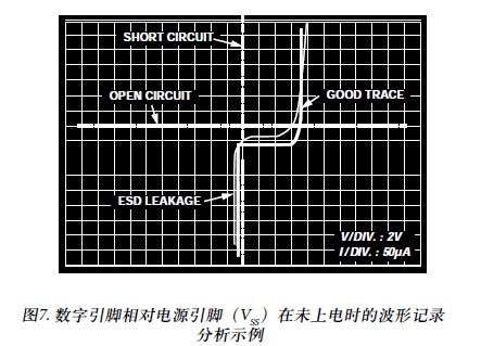 可以在相应位置上执行快速分析来评估器件是否受到过应力或可能遭受ESD事件。为了执行此分析,比较嫌疑器件和已知正常器件的引脚到引脚I/V结果,应使用波形记录器或类似设备。12位DAC的数字输入引脚(以VSS电源引脚为参考)上的一组典型短路、开路或ESD泄漏I/V迹线如图7所示。
