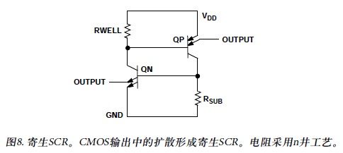 闩锁是一种潜在破坏性情况。这种情况会触发一个寄生有源元件,造成正负电源短路。如果电流不受限制,会发生电气过应力。闩锁的典型情况发生在CMOS输出器件中,两个寄生基-射结之一在过压事件期间暂时正向偏置时,驱动器晶体管和井形成pnpn SCR结构。SCR的开启本质上造成VDD和地之间的短路。