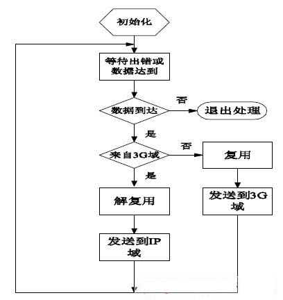 进行控制消息和媒体格式的转换,主程序的设计首先进行3G-324M 协议栈等各种数据结构的初始化,然后在3G 域和IP 域两个通道同时监听数据的到达。如果从监听返回的时候没有数据到达,则意味着某个通道出错,此时进行退出处理;如果从监听返回是因为3G域通道有数据到达,则将收到的数据根据3G-324M协议解复用后进行格式转换发送到IP 域的通道;如果从监听返回是因为IP 域通道有数据到达,则转换格式后根据3G-324M 协议复用并发送到3G 域通道。在后两种情况下,进行完数据转发后,继续回到监听3G域通道和IP 域通道的状态。程序流程图如图5 所示。