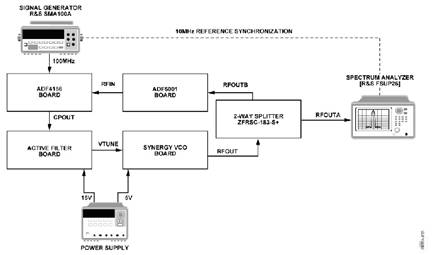 表1给出了该电路的设置,图2中显示的是测量结果与ADIsimPLL预测仿真性能的对比,可以看出结果非常吻合。测量的积分相位噪声为0.35 ps rms。测量设置如图3所示。