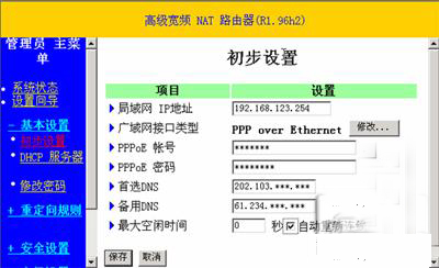 进入到路由器的设置页面,打开"基本设置"进入基本配置界面,选择"初步设置",您会看到出厂的默认设置,在"广域网接口类型"那一行,选择"修改"按钮,您会看到可供选择的广域网的类型,选择"PPP over Ethernet",再点"保存"按钮返回它的设置界面。如下图所示。 依次在"PPPoE 帐号"、"PPPoE 密码"、"首选DNS"、"备用DNS"中输入PPPOE的账号、PPPOE的密码、主域名服务器的IP地址。 "最大空闲时间",即在设定的时间内,如果网络中没有任何数据传输,路由器会自动断开与ISP端的连接。有时网络由于某些原因可能会出现断开现象,如果您需要路由器断开后能够自动再次建立连接,请选择"自动重新连线"选项,这样路由器就会自动重新建立连接。 点击"保存"按钮,然后路由器重新启动之后多台机器即可上网。当然,在这些共享上网的计算机中,IP地址中网关的设置要指向路由器的局域网地址,而不能像前面使用路由模式共享方式一样指定网关地址为modem的局域网地址。当然,在这我们也可在路由器上设置好DHCP服务器功能,以使它为网络中的计算机自动分配IP地址。 使用无线路由器的方式来共享ADSL线路,不但可提供无线计算机直接上网的功能,而且同时路由器又为用户提供大量的附加功能来管理网络,你提出报文过滤、MAC地址控制、QoS控制等,使用这些功能就可更方便地来对网络中的用户进行管理控制了。当然,在此种方案中,使用的路由器也不一定非要是无线宽带路由器才行,使用其他普通的有线宽带路由器同样也能为我们带来诸多的便利之处。