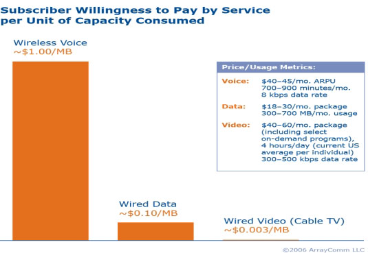 图1:针对所消耗的单位网络容量,用户表达为各类业务的消费意愿时,在语音、视频和数据业务方面的意愿支出显示出巨大差别