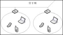 基础结构型WLAN利用了高速的有线或无线骨干传输网络。在这种拓扑结构中,移动节点在基站(BS)的协调下接入到无线信道,如图2所示。
