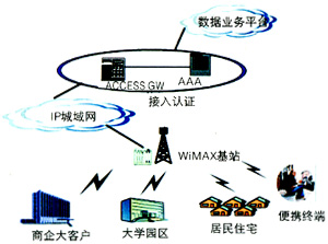 务器网络(CSN)可以由路由器、AAA代理或服务器、用户数据库、因特网网关设备等组成,CSN可作为全新的WiMAX系统的一个新建网络实体,也可利用部分现有的网络设备实现CSN功能。CSN为WiMAX用户提供IP连接,主要功能有:因特网接入,为用户会话连接,给终端分配IP地址;AAA代理或者服务器,用户计费以及结算;基于用户系统参数的QoS及许可控制;ASN之间的移动性管理,ASN和CSN之间的隧道建立和管理;WiMAX服务,如基于位置的服务、组播服务等。 2.4网络接口 WiMAX网络开放接口如图5所示。接口R1至R5为网络工作组初步确定了在Release1规范中定义的开放接口,接口R6至R8为后续版本中考虑开放的接口。各个接口的定义和功能如图6所示。 图5 WiMAX网络开放接口 图6 IEEE802.16空中接口协议栈模型 (1)R1:MSS与ASN之间的接口,可能包含管理平面的功能。 (2)R2:MSS与CSN之间的逻辑接口,提供鉴权、业务授权和IP主机配置等服务。此外,可能还包含管理和承载平面的移动性管理。 (3)R3:ASN和CSN之间互操作的接口,包括一系列控制和承载平面的协议。 (4)R4:用于处理ASNGW间移动性相关的一系列控制和承载平面协议。 (5)R5:拜访CSN与归属CSN之间互操作的一系列控制和承载平面协议。 (6)R6:BS和ASNGW间的互操作接口,属于ASN内的接口,由一系列控制和承载平面协议构成。 (7)R7:该接口属于ASNGW内部接口,图5中没有标注,具体定义还在讨论之中。 (8)R8:BS之间的接口,用于快速无缝切换功能,由一系列控制和承载平面协议组成。 2.5协议栈参考模型 IEEE802.16标准描述了一个点到多点的固定宽带无线接入系统的空中接口。空中接口由物理层和MAC层组成,见图6。IEEE802.16MAC层能支持多种物理层规范,以适合各种应用环境。 物理层由传输汇聚子层(TCL)和物理媒质依赖子层(PMD)组成,通常说的物理层主要是指PMD。物理层定义了两种双工方式:时分双工(TDD)和频分双工(FDD),这两种方式都使用突发数据传输格式,这种传输机制支持自适应的突发业务数据,传输参数(调制方式、编码方式、发射功率等)可以动态调整,但是需要MAC层协助完成。 MAC层分成三个子层:特定服务汇聚子层(CS,ServiceSpecificConvergenceSublayer)、公共部分子层(CPS,Common Part Sublayer)、安全子层(PS,Privacy Sublayer)。 (1)CS子层主要功能是负责将其业务接入点(SAP)收到的外部网络数据转换和映射到MAC业务数据单元(SDU),并传递到MAC层的SAP。协议提供多个CS规范作为与外部各种协议的接口。 (2)CPS是MAC的核心部分,主要功能包括系统接入、带宽分配、连接建立和连接维护等。它通过MACSAP接收来自各种CS层的数据并分类到特定的MAC连接,同时对物理层上传输和调度的数据实施QoS控制。 (3)安全子层的主要功能是提供认证、密钥交换和加解密处理。 3、WiMAX的应用模式 从技术特点分析,WiMAX不适合单独组网进行运营,从目前运营商的情况来看,WiMAX的应用模式主要有以下场景。 3.1固网宽带业务的接入 WiMAX固定应用模式采用符合IEEE802.16d标准的设备,工作频段根据标准规定和国家的频率划分可以为3.5GHz频段,载波带宽为3.5MHz。由于技术的限制,网络不支持小区间的用户数据的切换。终端设备的形式为固定安装在室内的或可携带的调制解调器形式。在WiMAX固定应用模式中,WiMAX网络主要作为IP/E1的承载。在光纤或其他有线资源到位后,网络设备可以移到其他地方布网。 WiMAX的固定应用模式主要包括两个方面,如图7所示: 图7 WiMAX作为固网宽带业务的接入 (1)家庭宽带接入市场 作为xDSL方式的互补。由于WiMAX设备成本呈现逐渐下滑的趋势,且用户峰值接入速率较高,安装方便,同时具有一定的便携能力,因此运营商可利用WiMAX技术,在客户端采用室内型CPE,快速进入个人宽带接入市场,提供宽带数据业务。 (2)商企等大客户接入市场 大客户接入主要实现基于IP和电路业务的综合接入。运营商可利用WiMAX作为数字分组网(DDN)、帧中继(FR)网络等有线接入平台的补充,在客户端采用室内型或室外型CPE。而新兴运营商或移动运营商可利用宽带无线设备迅速开展业务,抓住重要客户,弥补其固网资源的不足。 3.2NGN网络的接入 WiMAX可用作NGN网络的接入,如图8所示。利用IP语音业务可实时带宽分配、占用空中无线资源