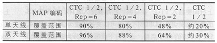 /2重复6次,可以在单发射天线时标准小区90%以上的覆盖范围,而CTC1/2重复2次,则只有越48%的覆盖范围,如表2所示:
