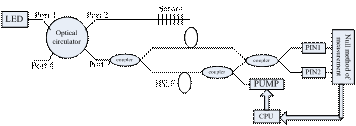 宽带光源发出的光经过耦合器入射到传感光栅上,被反射后送入非平衡M-Z干涉仪,通过干涉仪把Bragg波长