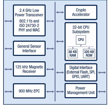 G2 Microsystems 公司开发的 G2C501, 是一个推出较早的超低功耗IEEE 802.11 (Wi-Fi) 芯片 (SoC) , 见图一所示, 该芯片内部集成了802.11无线芯片和基带芯片,包括了一个32位MCU和80KB SRAM+320KB ROM, 并且具有125K无线唤醒和支持ISO 24730-2 无线定位的硬件功能。