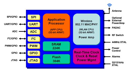 GainSpan公司最近推出WiFi 芯片GS1010,(该公司是芯片巨人英特尔投资支持的美国硅谷的创新企业), 这个以两个经典ARM7微控制器器为内核的32位"ARM射频SoC (ARM无线片上系统), 将两个ARM7 32位微处理器,384K闪存,224k SRAM多种外围电路,A/D,RTC和802.11无线芯片等全部设计成一只非常小的QFN封装微型单芯片中(102脚 10X10平方毫米大小),实现了Wi-Fi系统的单片机化,无线化,微型化,使设计者可以采用GS1010单片机来设计微型遥控器,信用卡一样薄的微型RFID电子标签,能置入人体的微型传感器等等电池供电产品和多种应用产品。