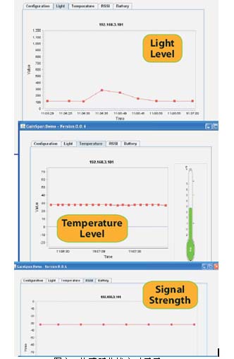 运行WI-FI 传感器网络PC表演软件,你可以在PC上,通过屏幕,看到通过WI-FI网络无线传输过来的传感器信息, 如图六所示。