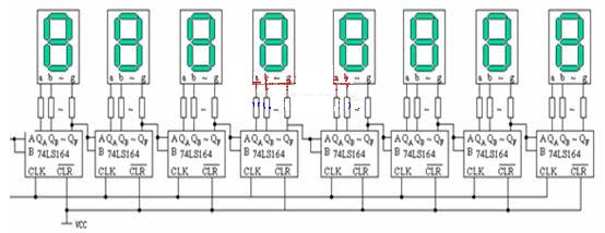 如图4所示,该系统的显示是使用的静态显示,应用74LS164的串入并出的特点,将显示编码通过单片机的串口发送到74LS164上锁存而实现稳定的静态显示。在74LS164和数码管之间串接1K的电阻限制电流,起到保护作用。