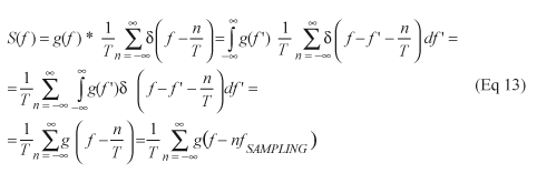 计算上面的积分比较复杂。为了简化计算,注意到s(t)是g(f)与冲激脉冲序列的乘积。同时我们还知道时域的乘法对应频域的卷积。(关于这一结论的证明可参考任何有关傅立叶变换的资料。) 因此,S(f)可以表示为: